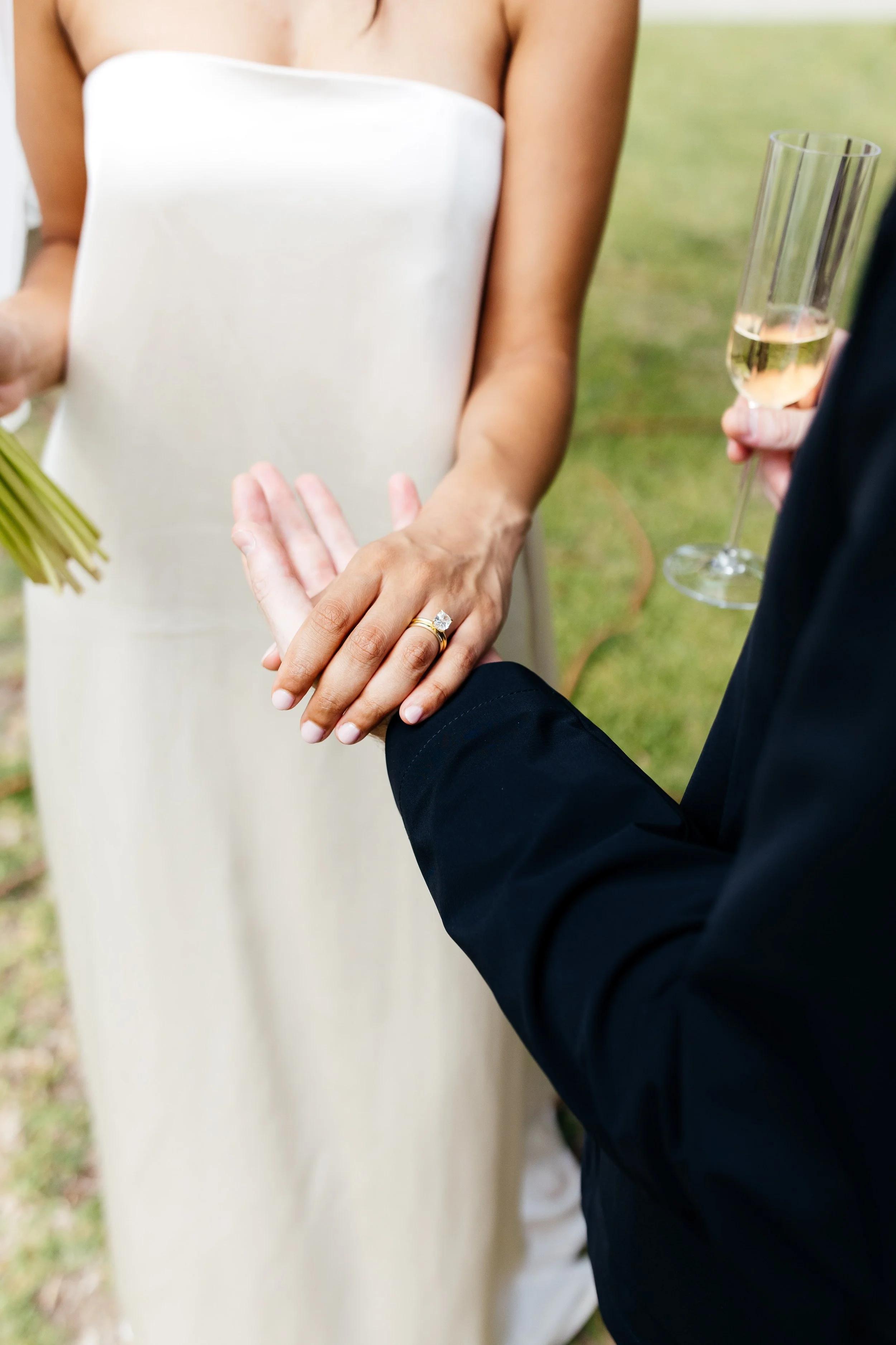Woman in a white dress holding a glass of champagne outdoors, smiling.