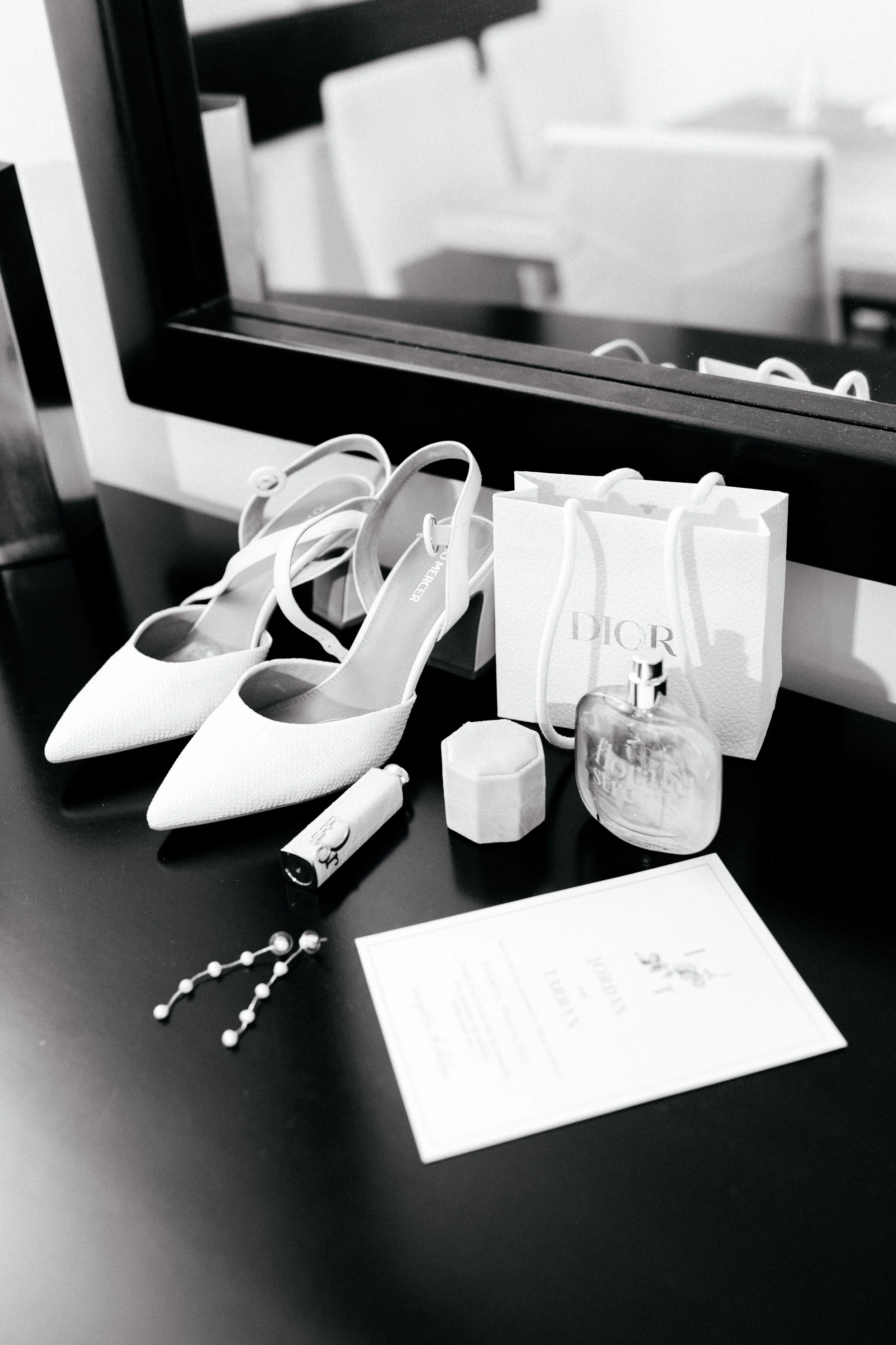 A pair of white Manolo Blahnik shoes with large rhinestone buckles, gold floral earrings on white tissue paper, a tube of lipstick, a bottle of Chanel No. 5 perfume, and a tube of lipstick on a white outdoor table with a white chair and gravel backgr