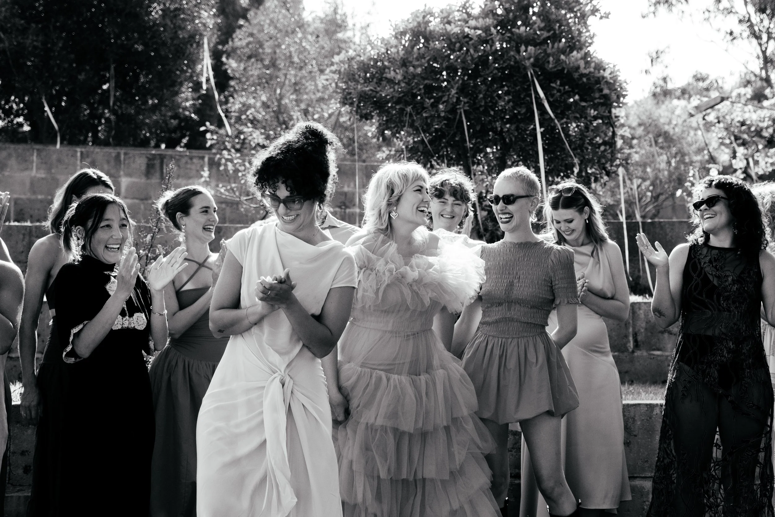 Black and white photograph of a wedding celebration, with a bride and groom walking together in the foreground surrounded by their wedding party outdoors.