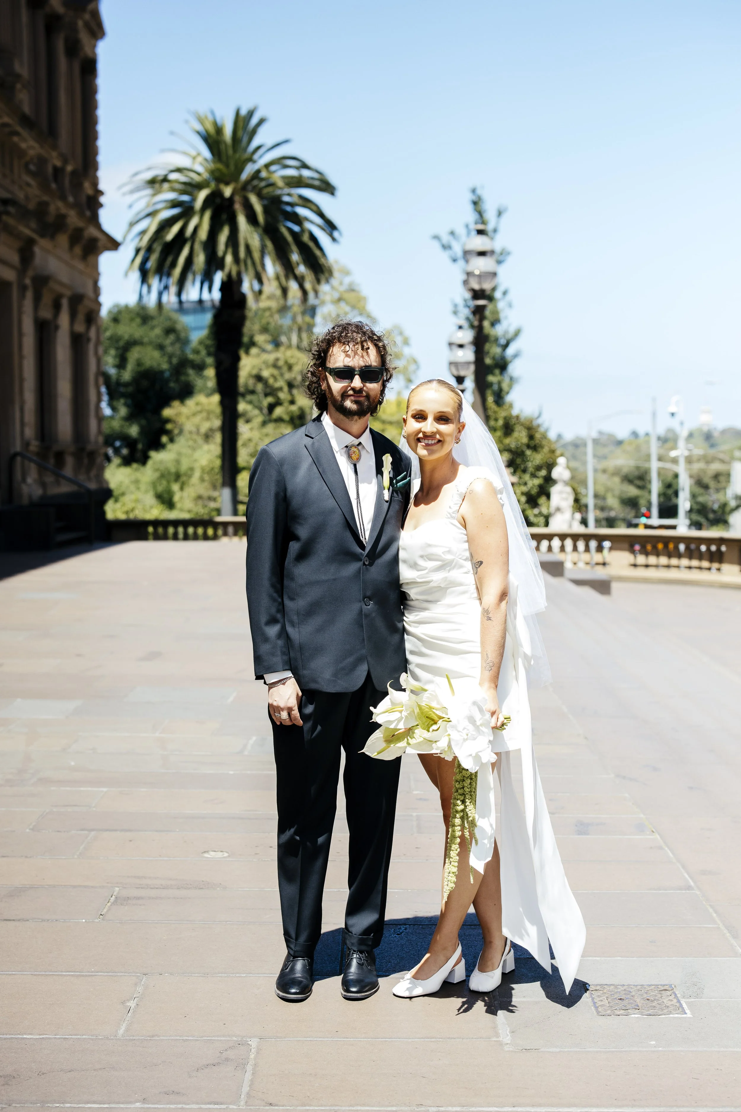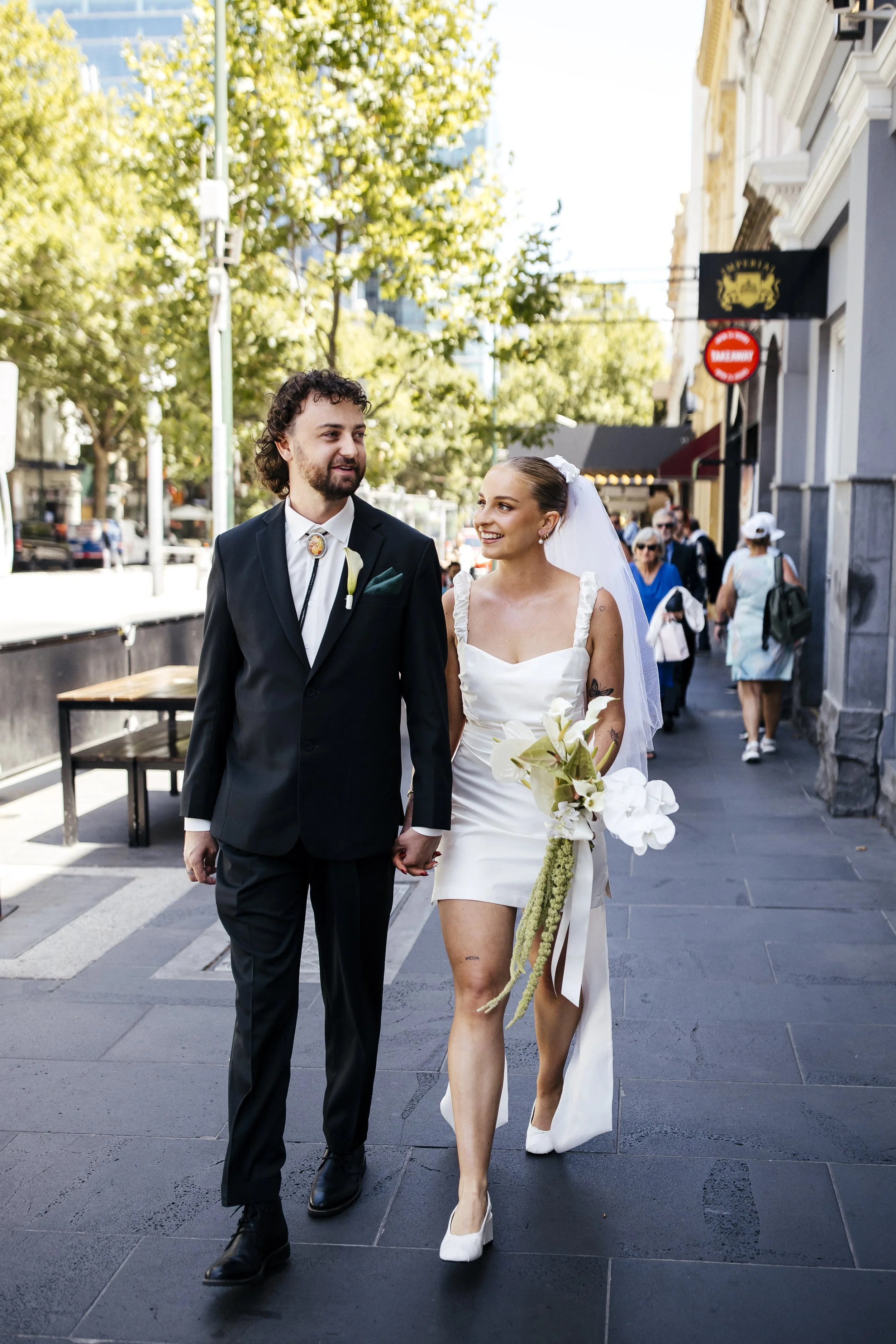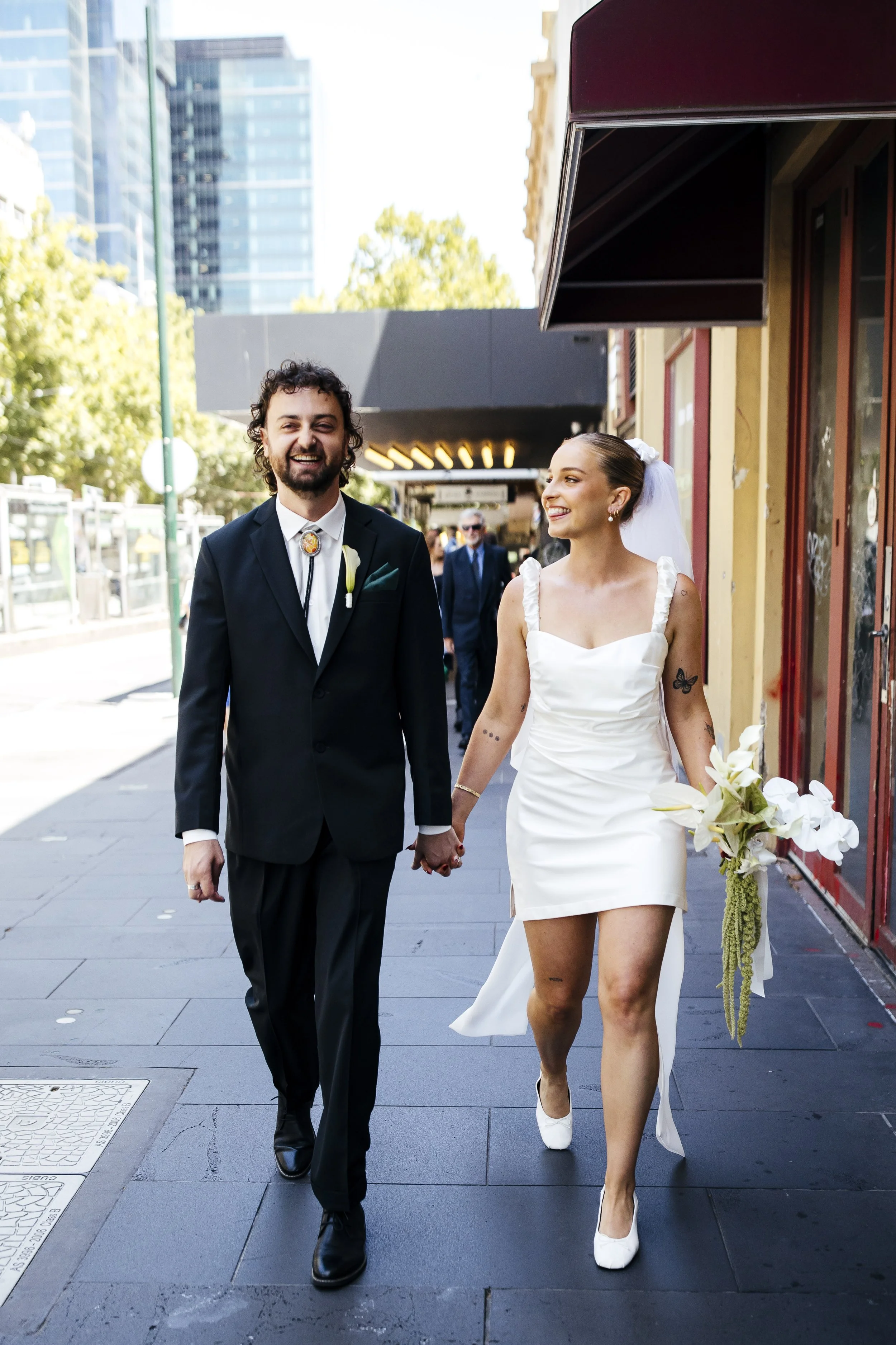 A smiling newlywed couple walking hand in hand on a city sidewalk on a sunny day, with the bride carrying a bouquet of white flowers and the groom wearing a dark suit and bolo tie.
