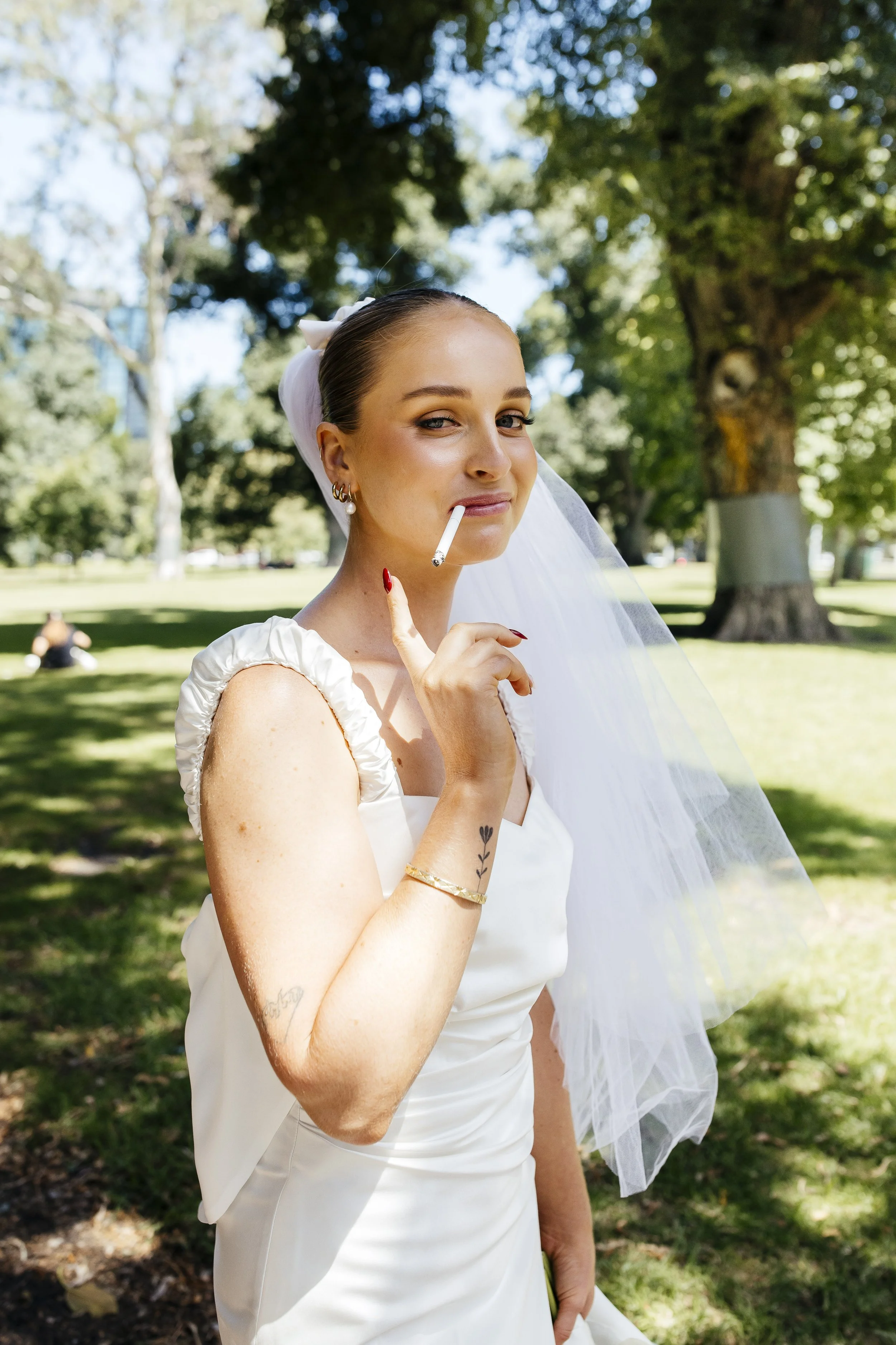 A woman in a white dress and veil, with a cigarette in her mouth, standing outdoors in a park with trees and sunlight.