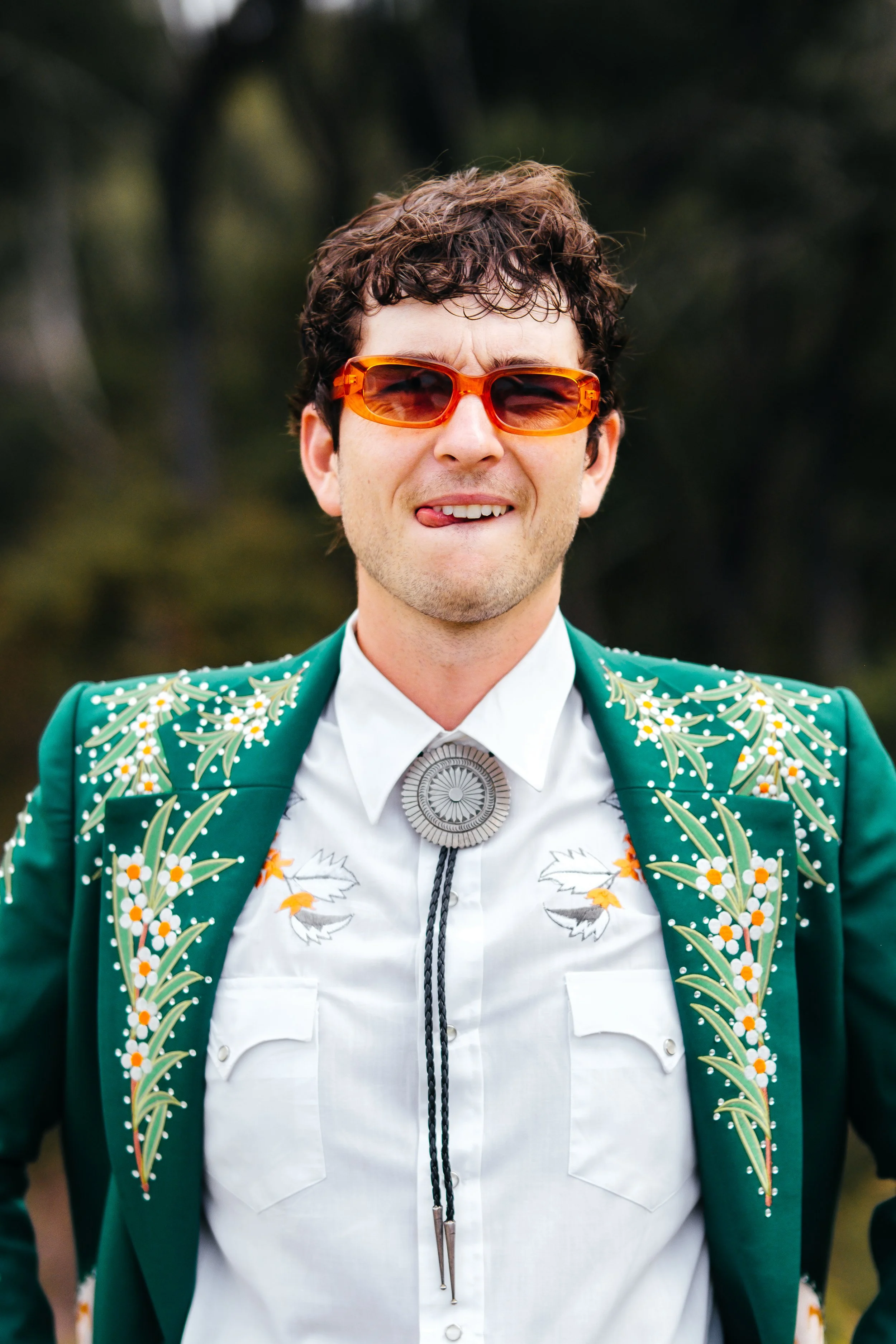 A man biting his lower lip, wearing orange sunglasses and a green embroidered jacket over a white shirt with embroidered birds, outdoors with blurred trees in the background.