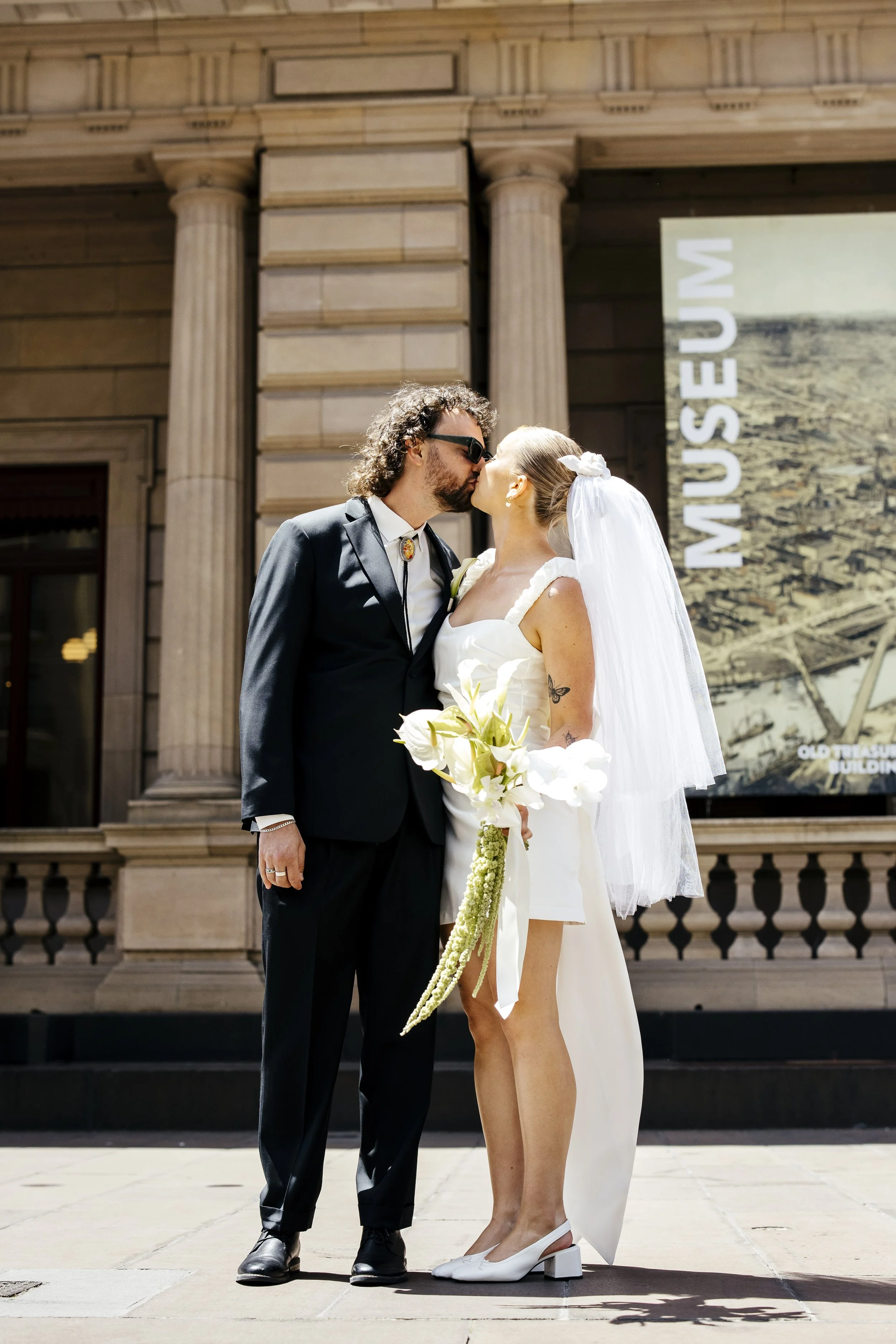 A bride in a white satin wedding dress with a lace veil and holding a bouquet walking arm in arm with a groom in a black suit on a sidewalk