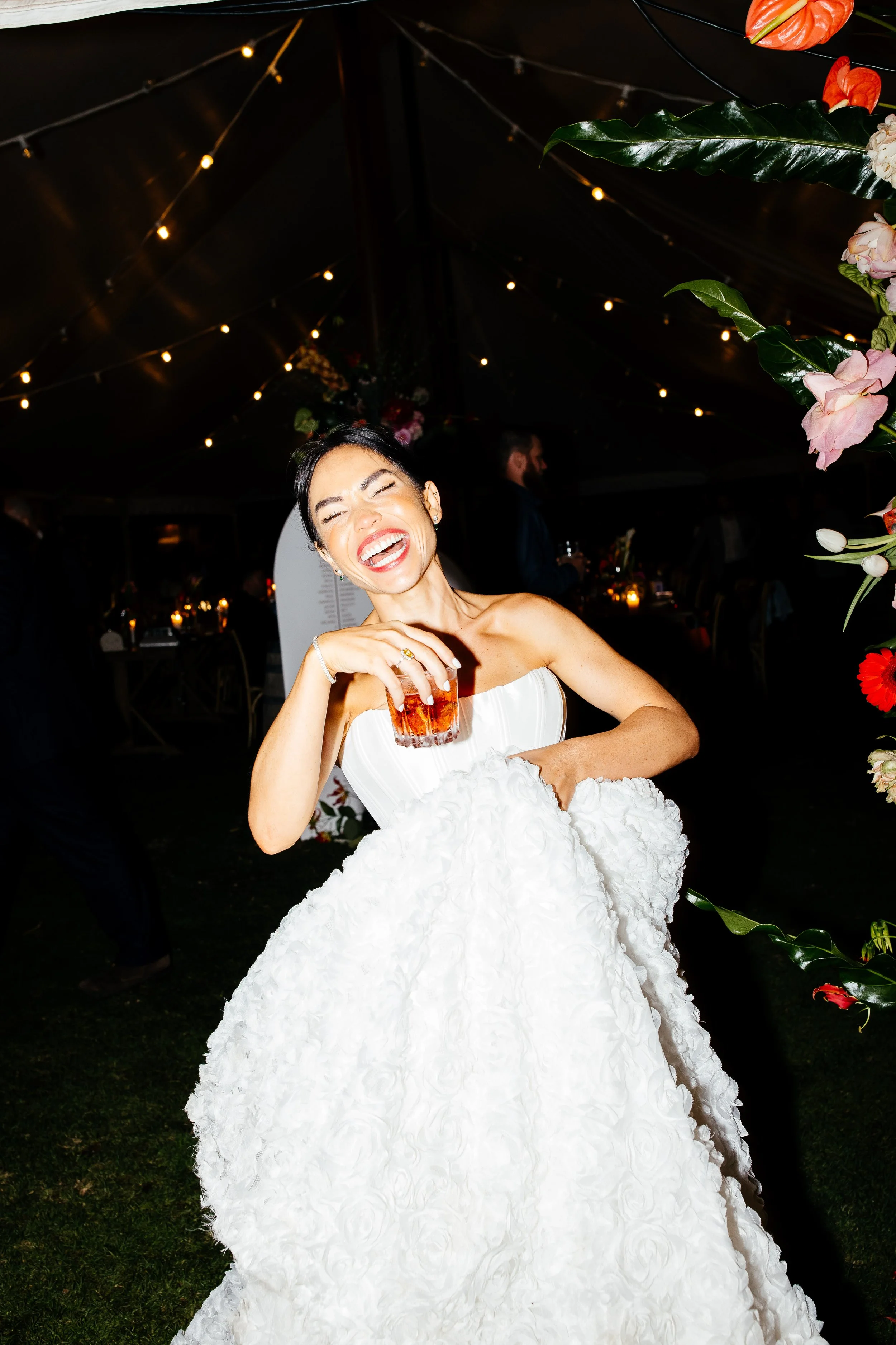 Woman in a wedding dress laughing and holding a drink at a festive event inside a tent decorated with string lights and flowers.