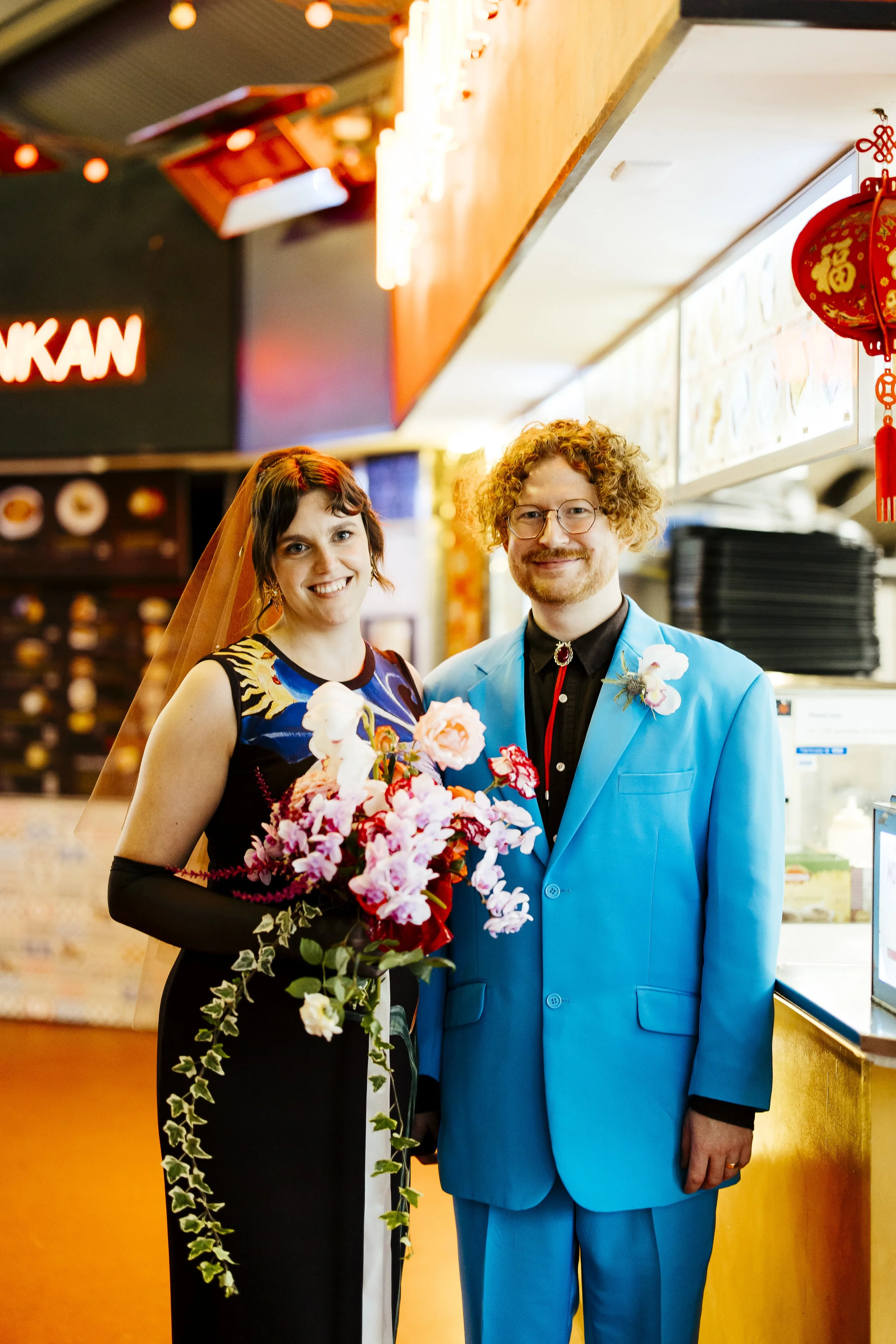 A happy couple embraces during their wedding, with the bride wearing a dark dress and veil, and the groom in a bright blue suit holding a large bouquet of colorful flowers, standing in front of a yellow structure.