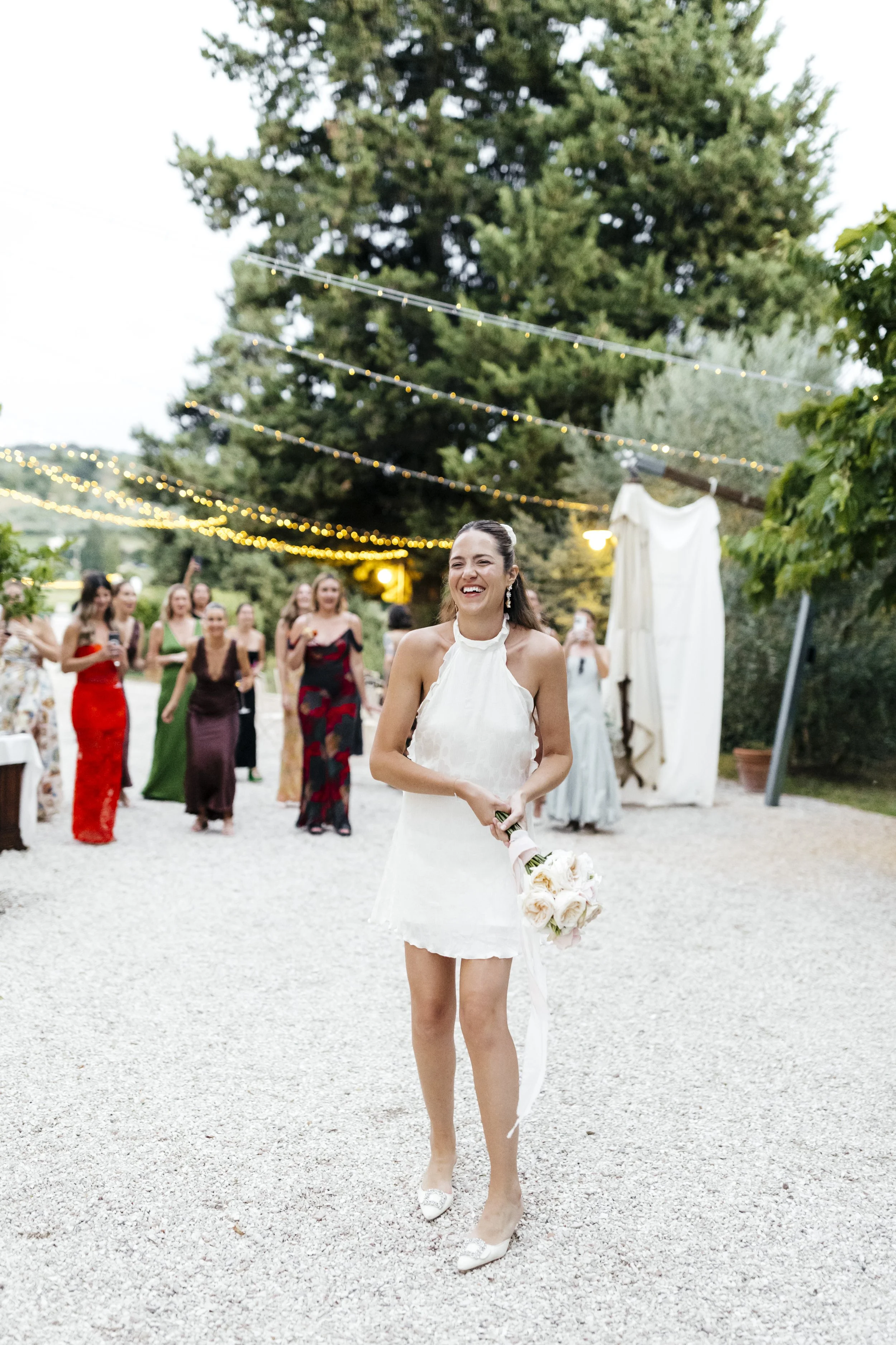 A woman in a white dress holding a bouquet of white and pink roses, smiling as she walks towards a group of women dressed in colorful dresses at an outdoor wedding celebration. String lights and trees are in the background.
