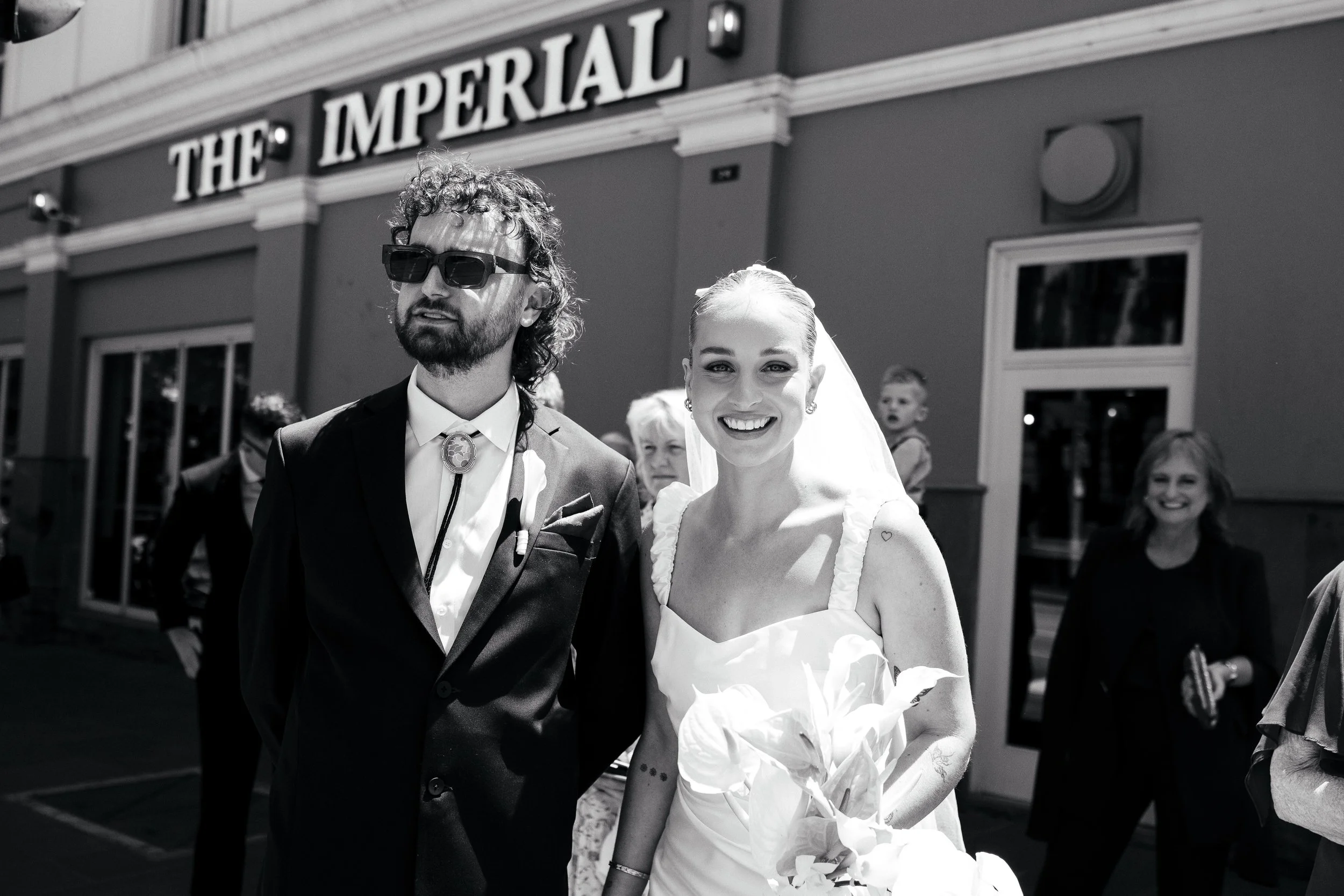 A smiling bride in a white dress holding a bouquet of flowers standing next to a man in a dark suit and sunglasses outside a building with a sign that reads 'The Imperial'.