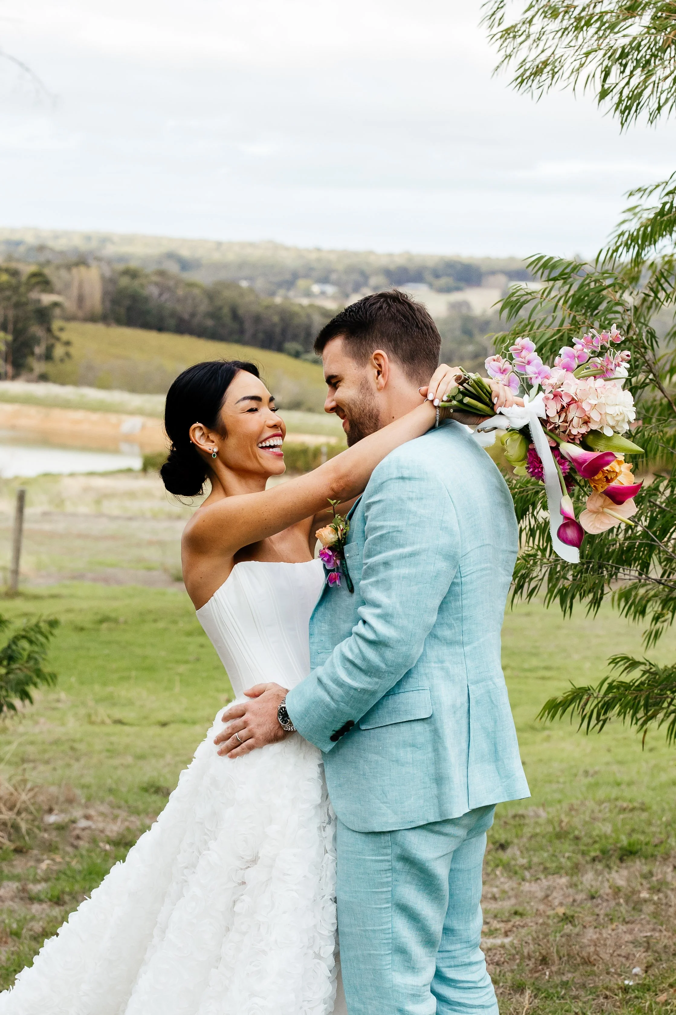 A bride and groom share a joyful moment outdoors, with the bride holding a bouquet, set against a scenic rural landscape.